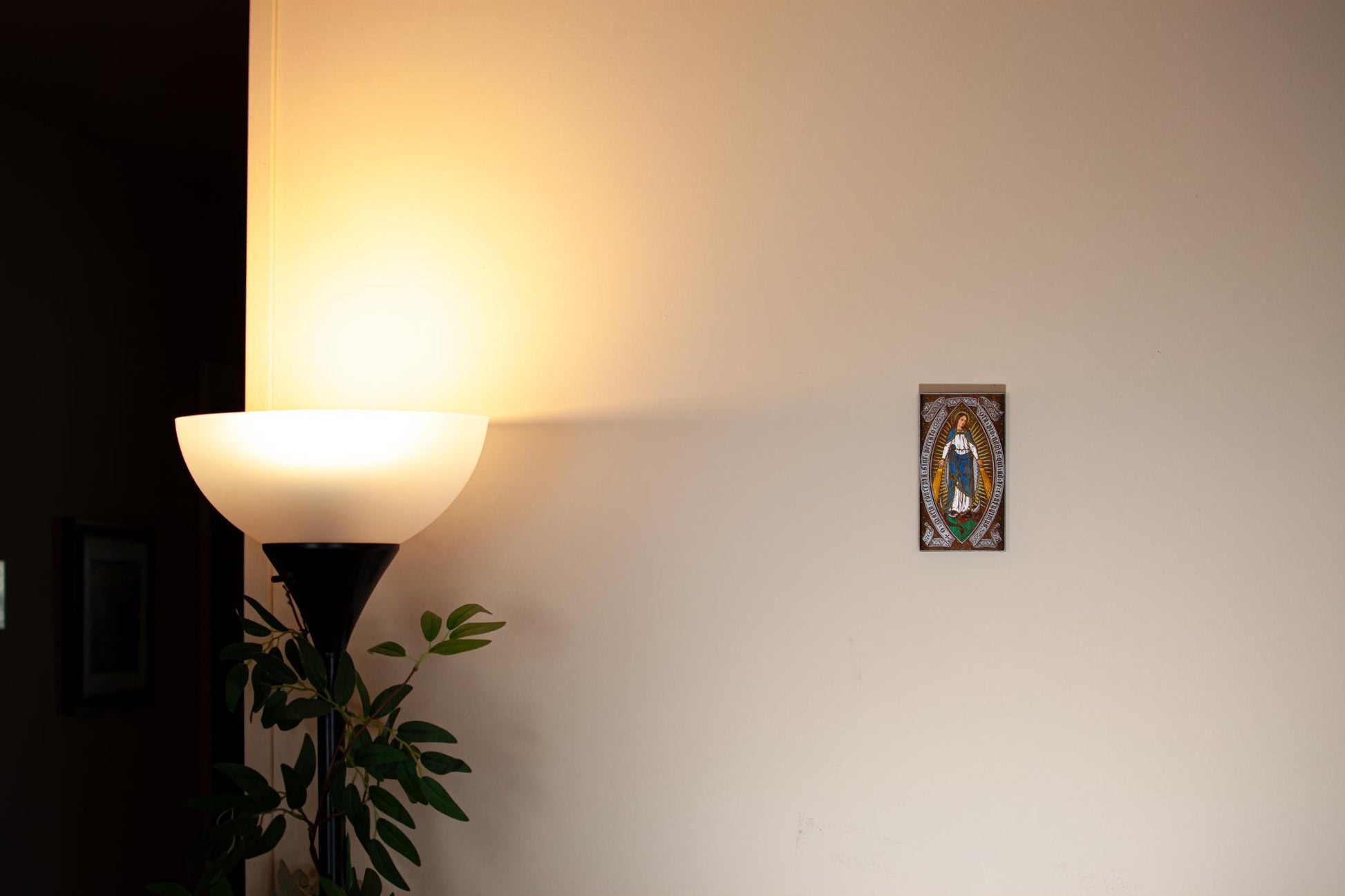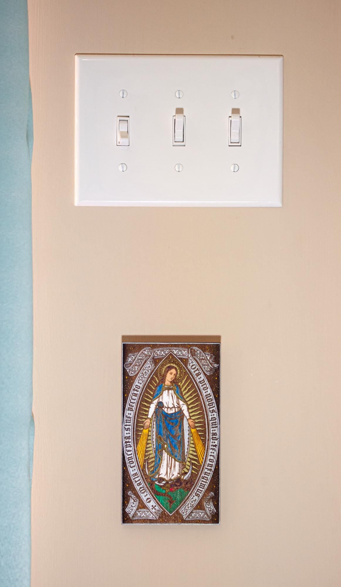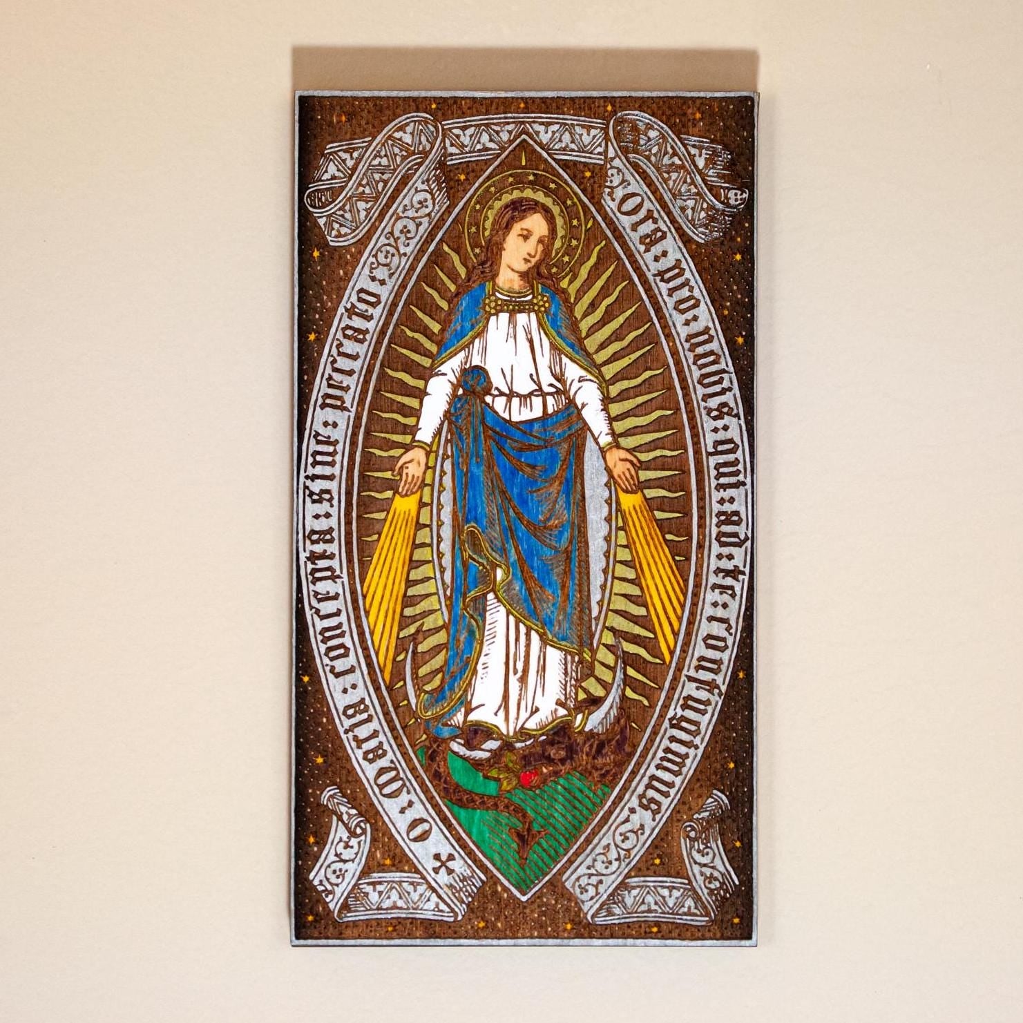 Add a reminder of our Faith to your home or work area with this mini wood wall art. Sturdy Birch wood paneling, beautifully engraved with an image of Our Lady of Grace, then meticulously hand-colored, it serves as a thoughtful reminder of our faith. Complete with an integrated keyhole hanger on the back, this piece measures approximately 3.25" x 5.75", compact enough to not take up a whole wall but large enough to catch a glimpse across a room. Proudly engraved and hand-colored by a small business in the USA, a perfect gift for housewarmings, weddings, any occasion celebrating faith and family traditions, or addition to your family's daily Catholic living.