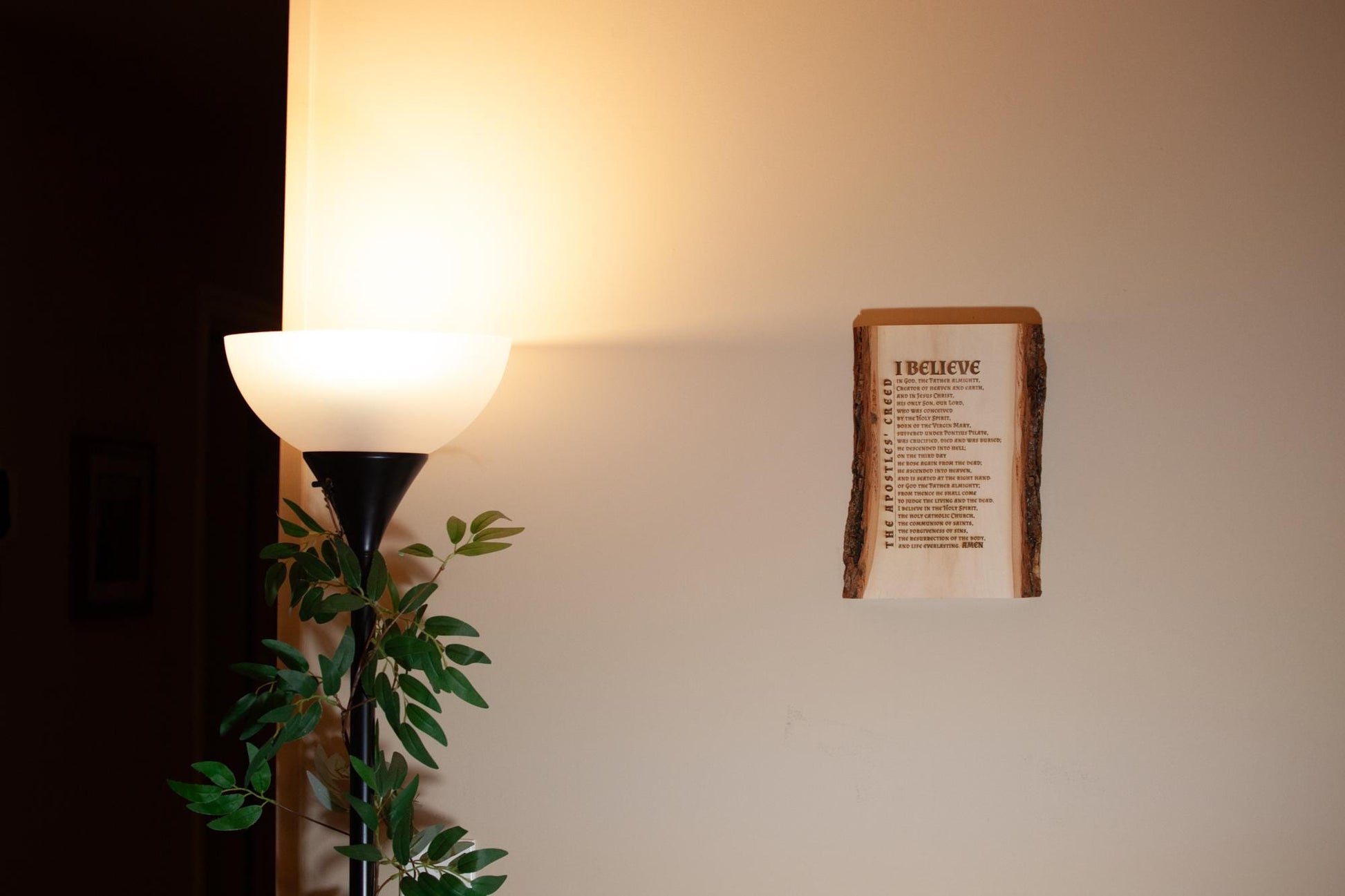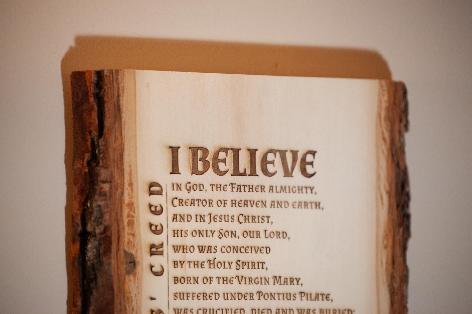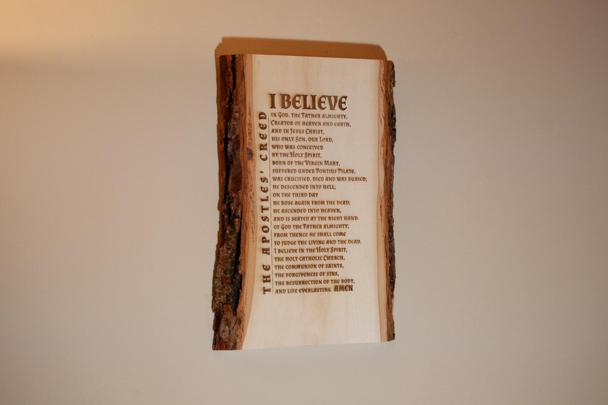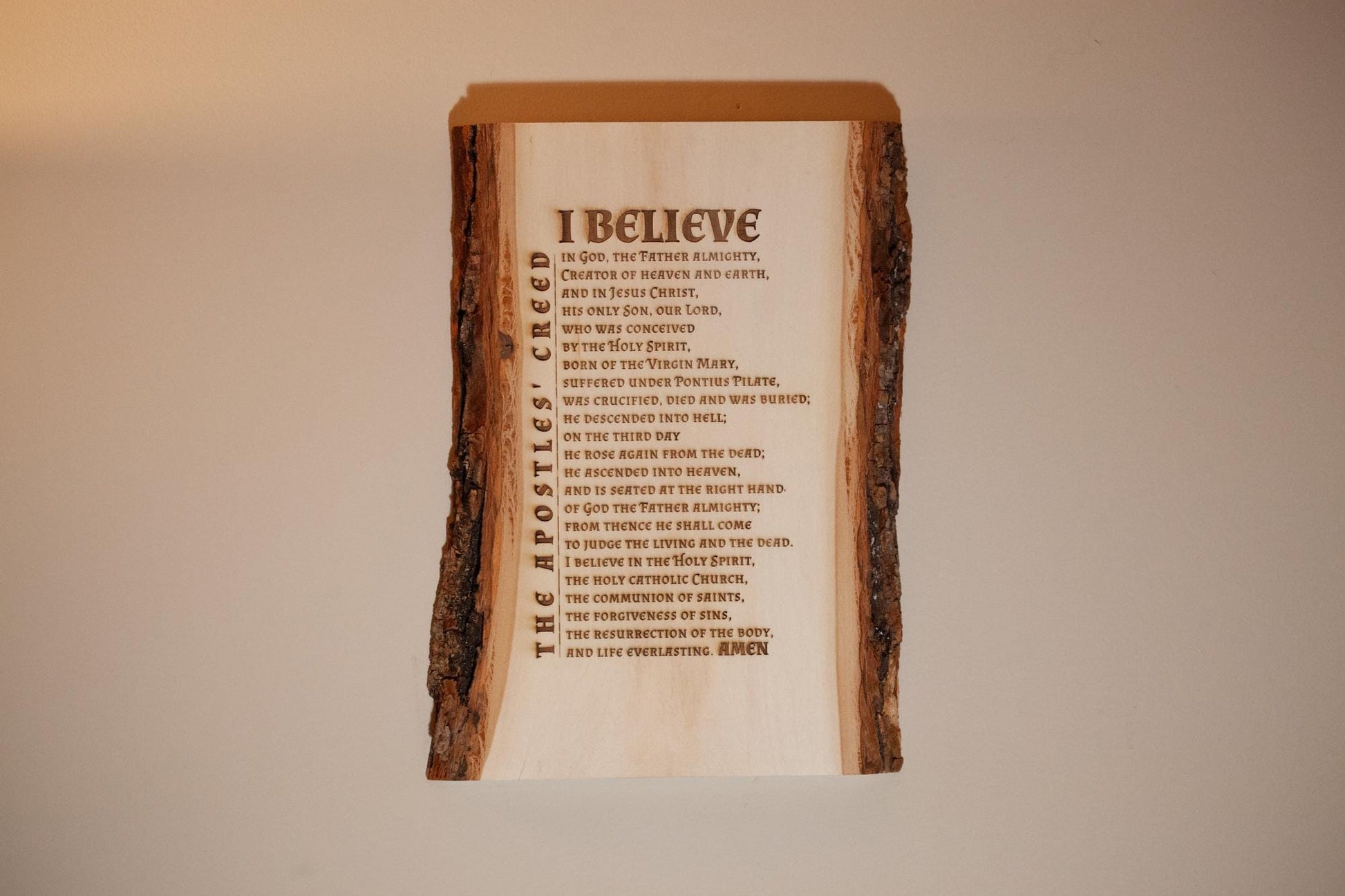 The Apostles' Creed, I Believe, 7.5 x 11 inch Laser-Engraved Wood Wall Art with Bark Edge, Engraved in the USA