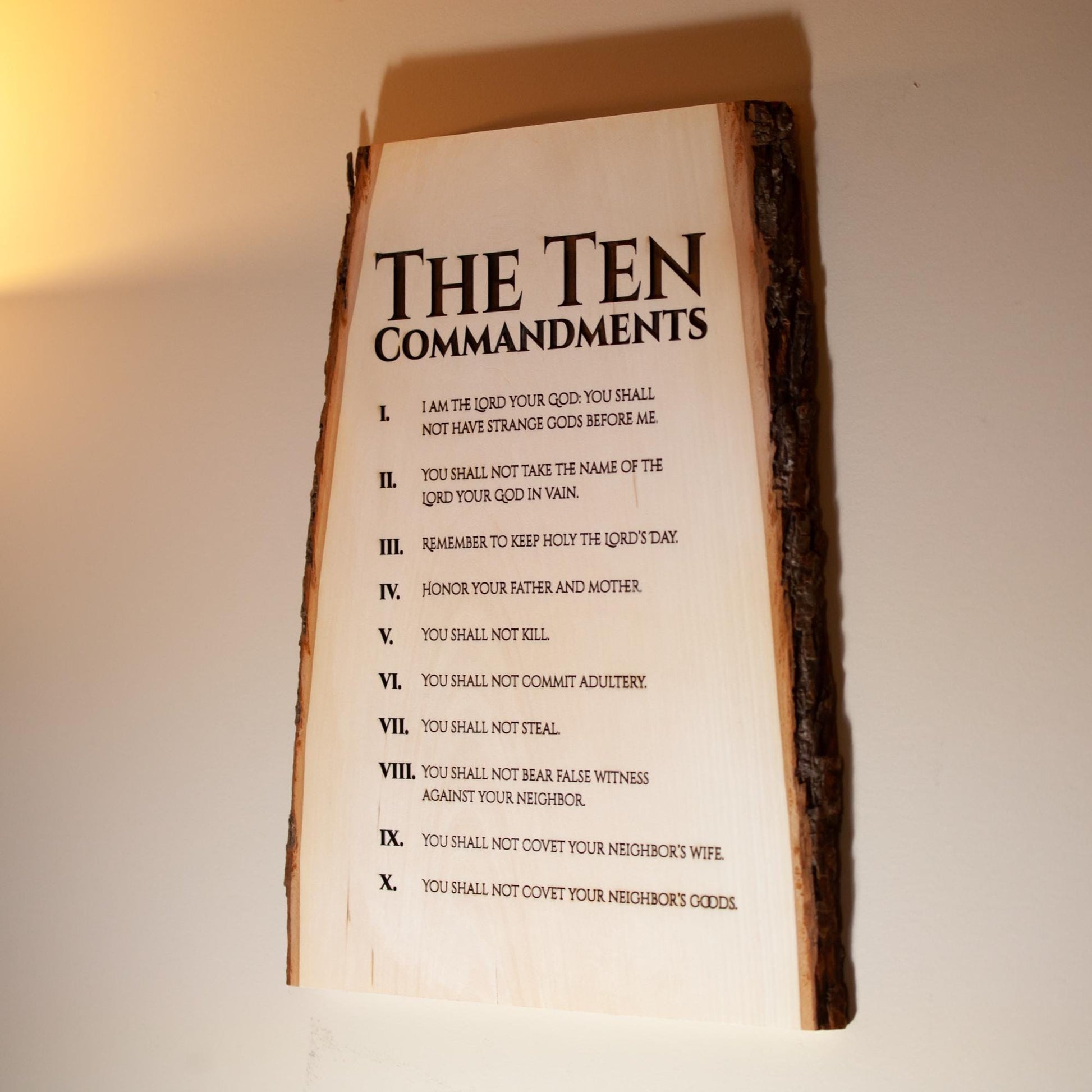 The Ten Commandments, 11" x 16" Laser-Engraved Wood Wall Art with Bark Edge, Engraved in the USA, Catholic Living