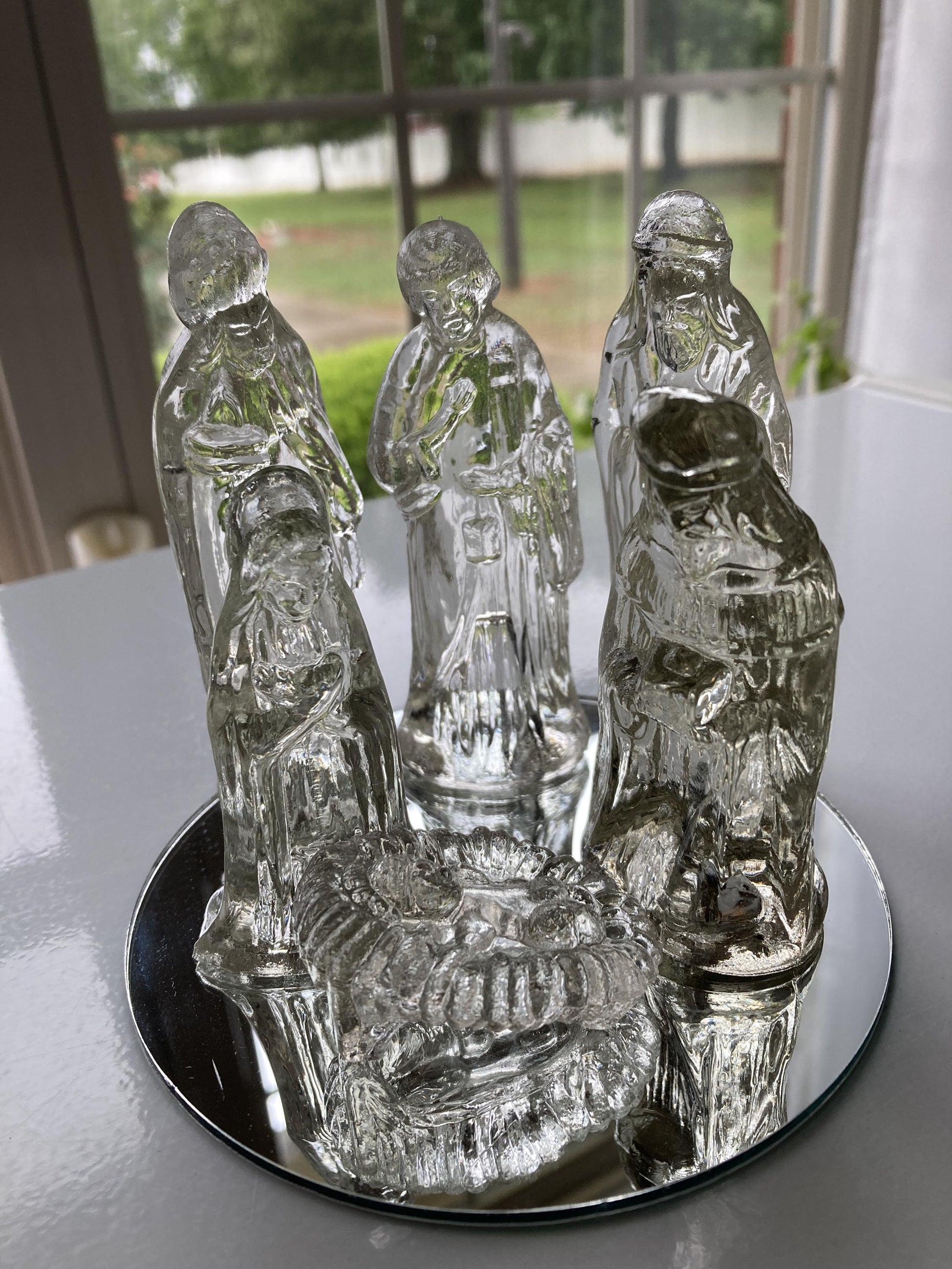 Standing approximately 4" tall, this Vintage 1988 Set/7 Glass Nativity W/Mirror includes 6 clear glass Nativity figurines with a mirror. Box is included. This small Nativity scene shines beautifully in the light and can be a wonderful reminder of your faith and of the joy of Christmas!